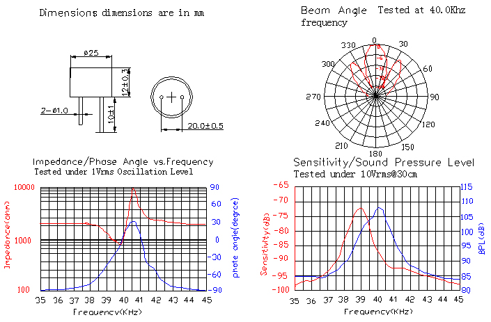 | Transmitting sound Pressure Level at resonant frequency;0dB re 0.0002μbar per 10Vrms at 30cm | 108 dB | ||