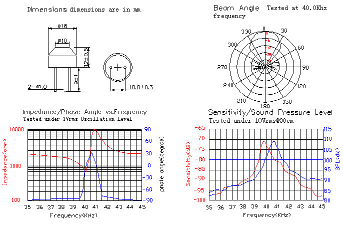 | Transmitting sound Pressure Level at resonant frequency;0dB re 0.0002μbar per 10Vrms at 30cm | 110dB | ||