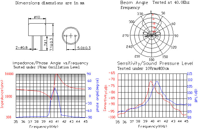 | Transmitting sound Pressure Level at resonant frequency;0dB re 0.0002μbar per 10Vrms at 30cm | 120 dB | ||